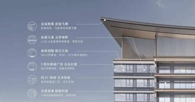 外立面以高技法演绎高规格型材,采用原创冠云屏,打造高级优雅的公建化立面。实现的是横向舒展的全面屏自由长窗,南面窗墙比高达80-83%,以及大约35米的采光面,超大环幕视野,突破空间界限。