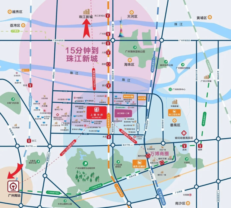 地铁3号线|黄金大动脉3号线大石站,约900米,2站万博CBD/海珠,6站达珠江新城/琶洲。