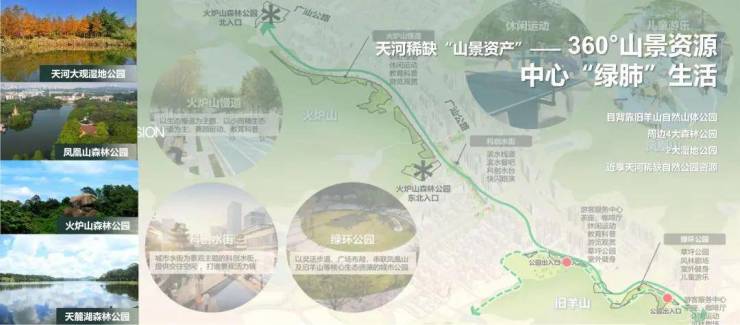 火炉山森林公园、凤凰山森林公园、天麓湖森林公园,引山入园,山园相容,打造广府自然家。