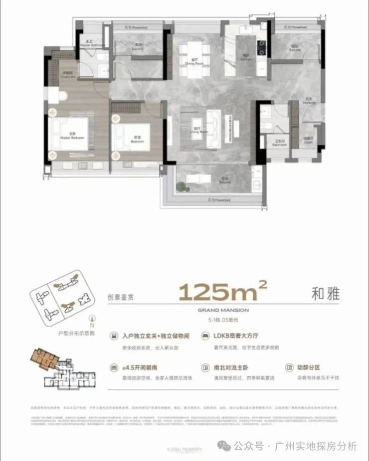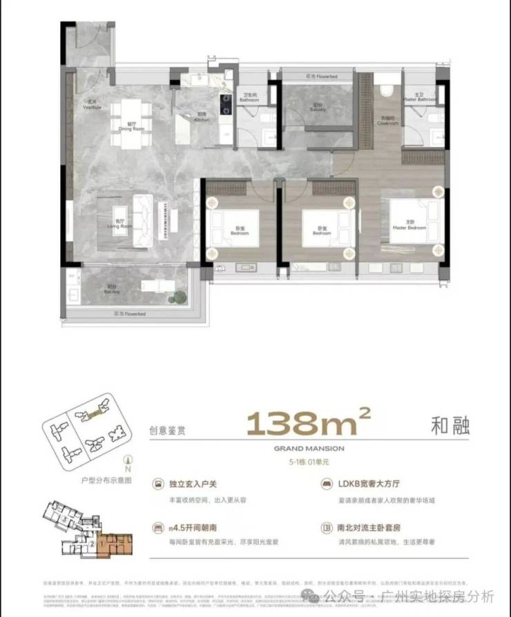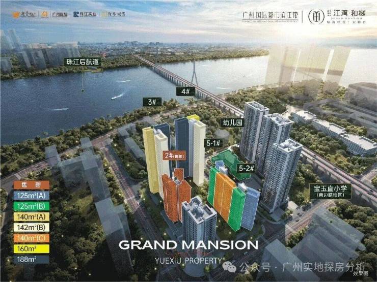 项目分三部分规划,鹤洞桥以北规划为商业,中间部分分为回迁房以及幼儿园,南部规划了4栋商品房和1栋回迁房还有3栋商业楼栋。3、4、5栋直线距离珠江仅约300米。西南向望江景和城景,东北向赏社区园林,坐拥双面视野。
