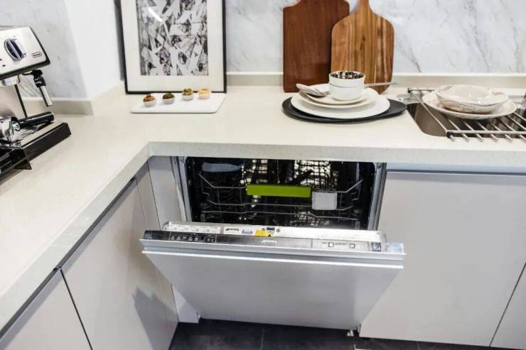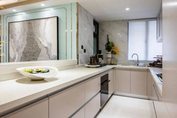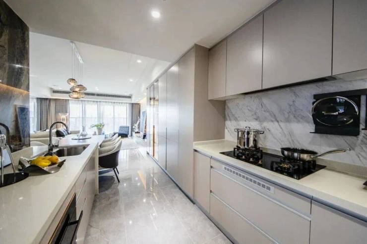平滑细腻的视觉感受,与客厅的空间设计、材质相统一。为了使厨房空间更具观赏性,设计师将烟机、冰箱、洗碗机隐藏,厨房整体线条更加流畅。