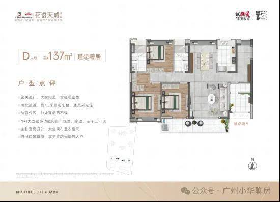 约137㎡3+1多功能空间,约7.5m观景阳台,南北对流,阔绰主套,带步入式卫生间,像更大空间,满足三代同堂