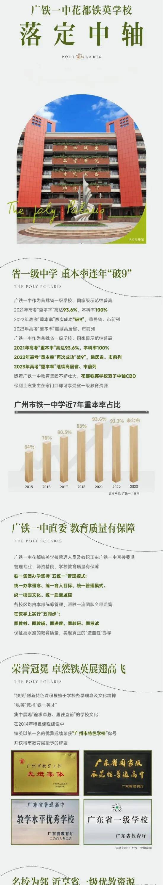 自带18班幼儿园、配建九年一贯制公立中小学,广铁一中花都铁英学校正式入签约,直线距离项目约500m,预计2025年9月开学。