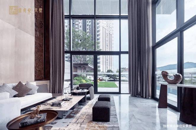 约6.9米挑高会客厅,落地玻璃的设计,在放大空间的尺度感之余,将更多白云山的自然生命力延伸进生活。室内与室外的连接与隔断、结合光影线景构筑次序空间,浪漫的表达出缓慢与轻盈的优雅生活。佳兆业·天墅展现了对健康住宅的匠心坚持