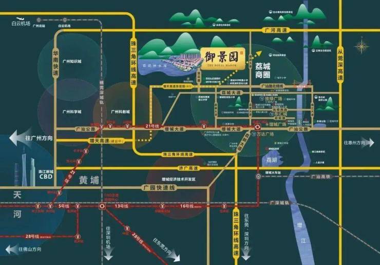 百花山庄御景园位于国家“粤港澳大湾区”的广州增城区内,是整个粤西区域链接大湾区的枢纽核心。
