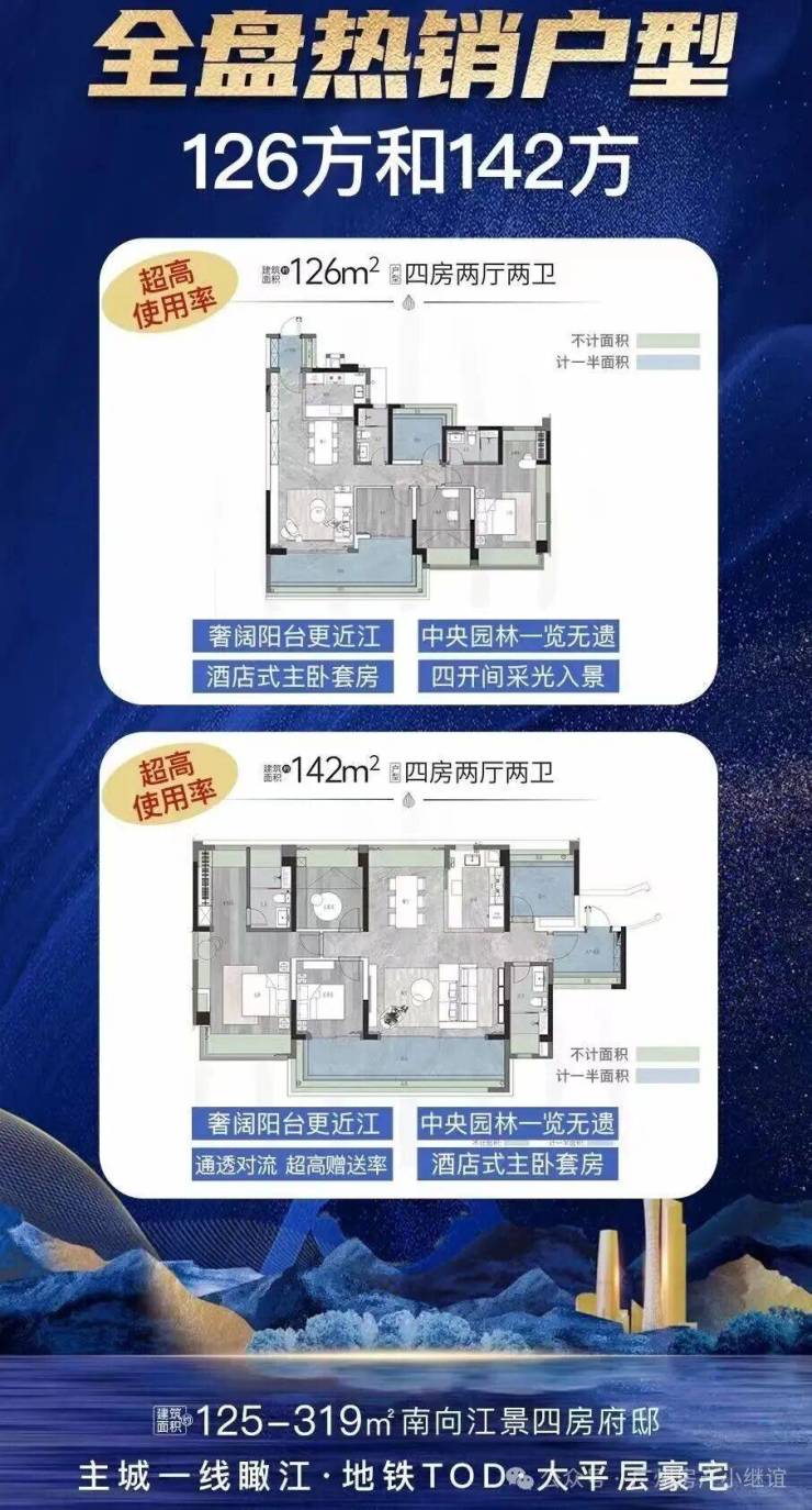超高使用率,江景豪宅,市场罕有[超高实用率]、[4面宽朝南看江]、[阳台宽达2.2米,高层长度8-9米,大平层长度17-24米]