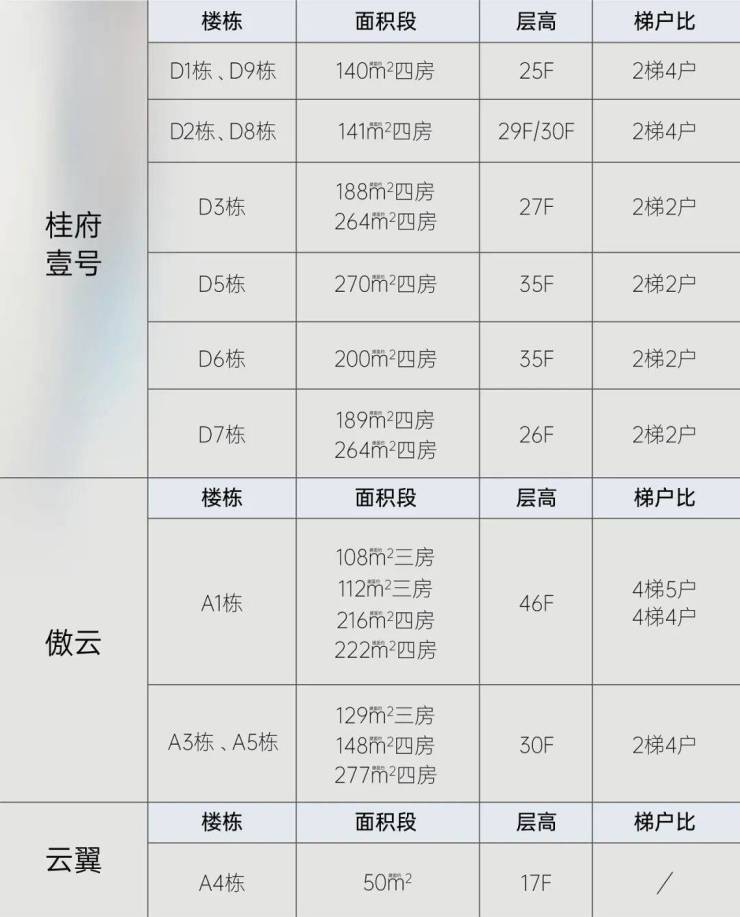 项目目前在售的分为三个组团,分别是住宅的“桂府壹号”组团和公寓产品”傲云“、”云翼“组团。目前写字楼还没对外出售。