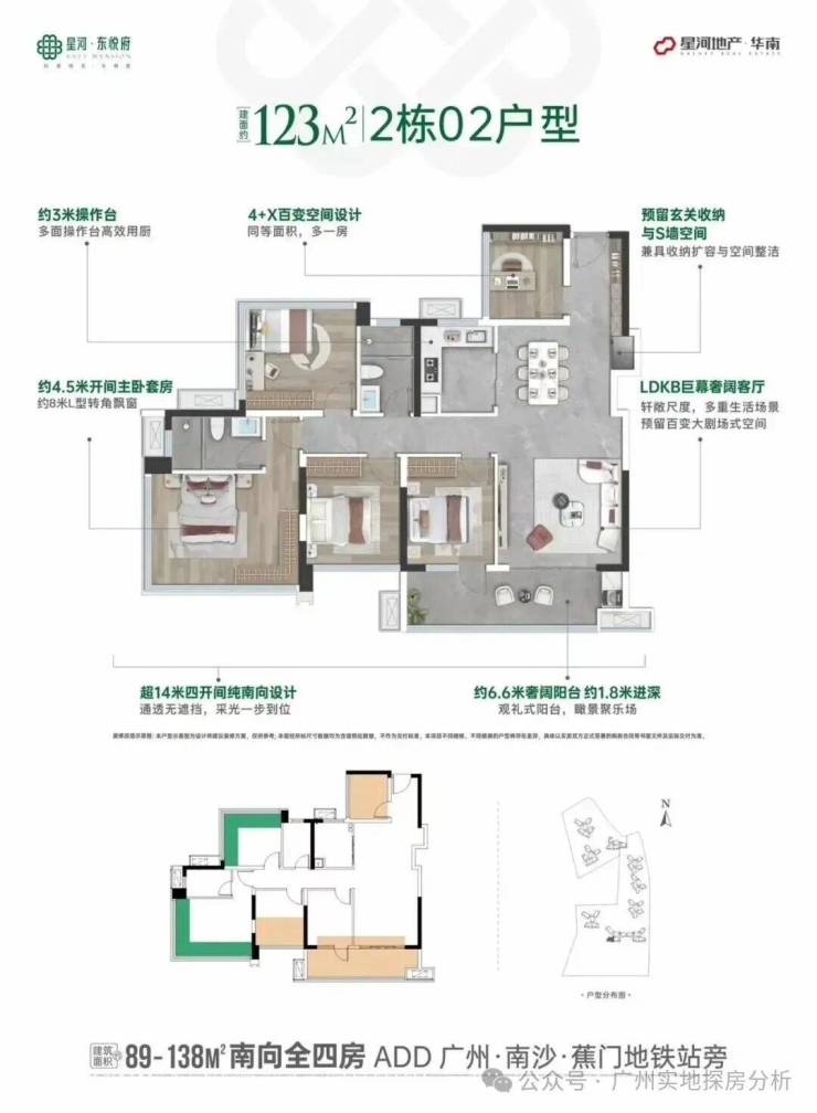 开发商:星河控股 开盘时间:2025年10月17日交付时间:2028年4月30日,精装修总占地面积:4.57万㎡总建筑面积:约20.29万㎡总栋数:9栋,分两期开发总户数:约1140户容积率:约3.38绿化率:约30%楼层高:3米梯户比:两梯四户、两梯五户使用率:至高128%车位数:约1336个,1:1.17物业管理:星河智善生活,物业费2.8元/㎡产品:89/106/122㎡全四房/138㎡双主套