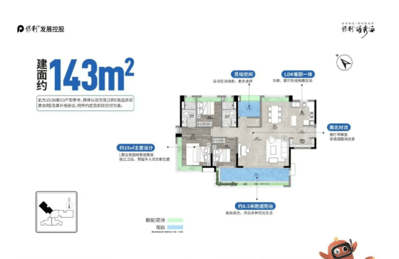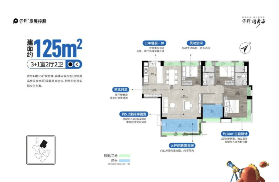 125 平四房两卫,改善型户型,18 方豪华主套,L 型全景飘窗,12 米南向采光;143 平四房两卫,南北对流,约 8.5 米长阳台,西南西望园林,北向看海,主卧 270 度全景飘窗;170 平四房两卫,9 米跑道大阳台,南北对流,正南向看园林,北看海,舒适度与私密性都很好。