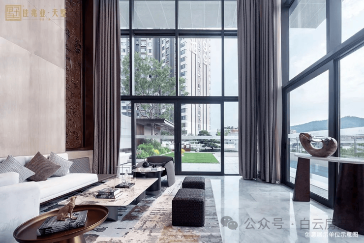 约6.9米挑高会客厅,落地玻璃的设计,在放大空间的尺度感之余,将更多白云山的自然生命力延伸进生活。室内与室外的连接与隔断、结合光影线景构筑次序空间,浪漫的表达出缓慢与轻盈的优雅生活。