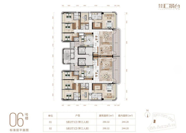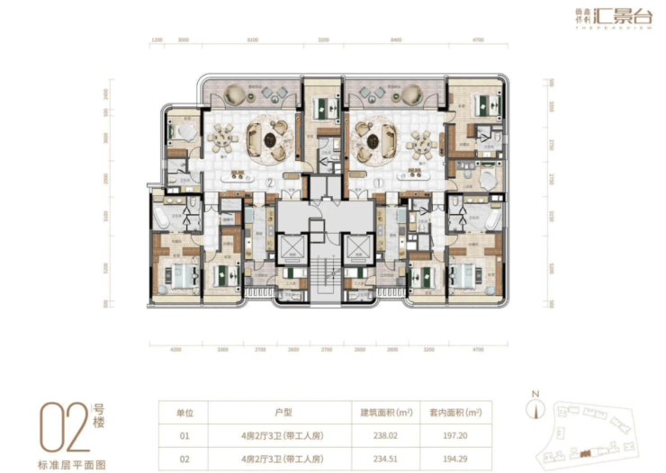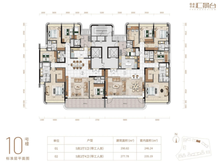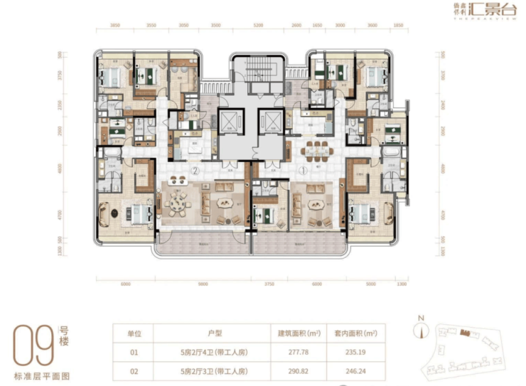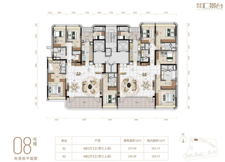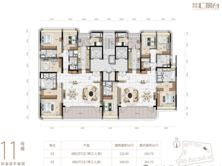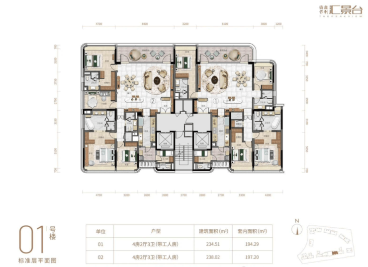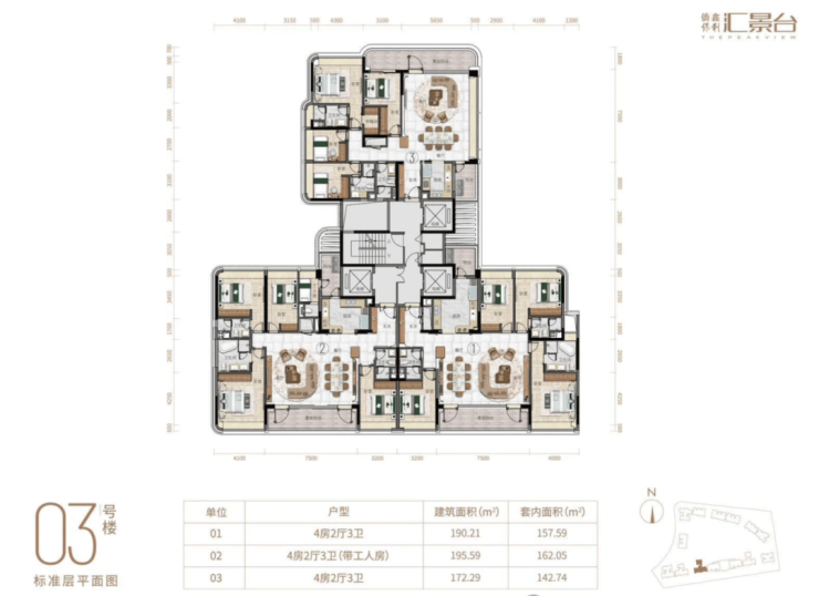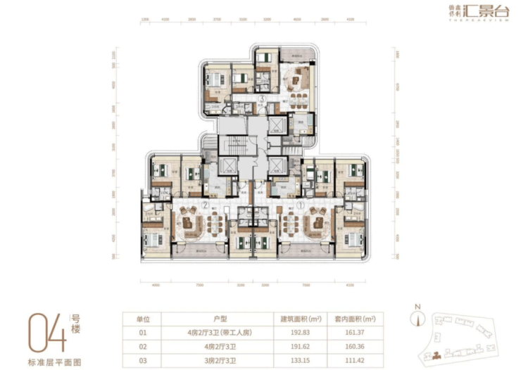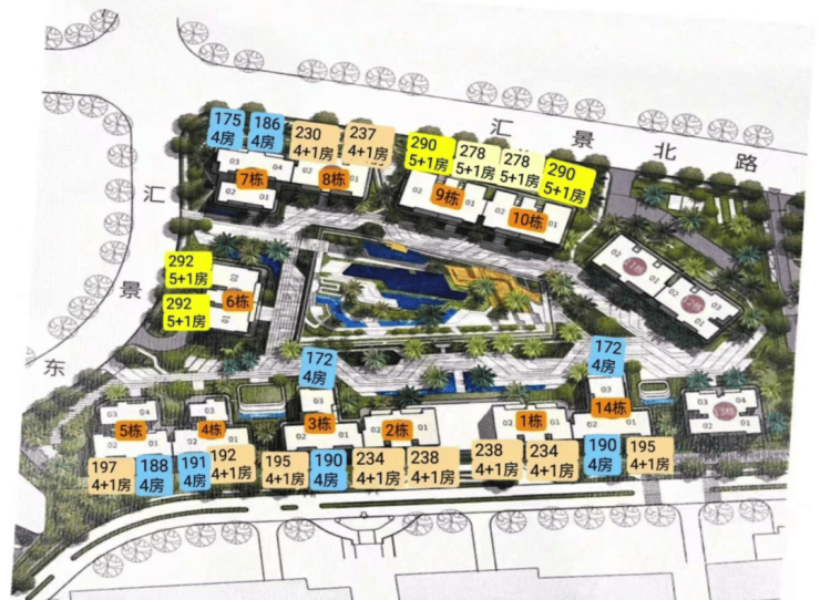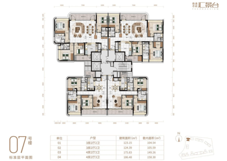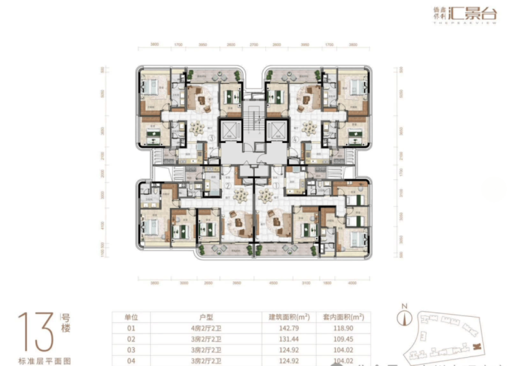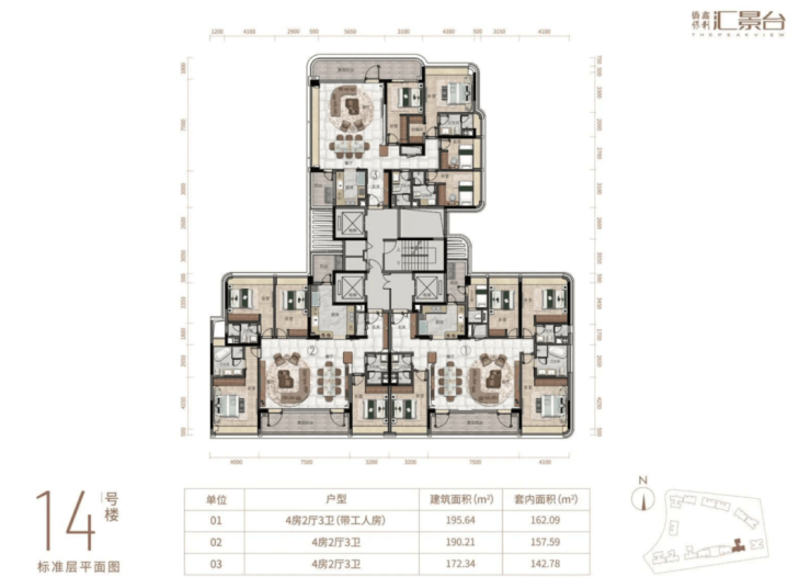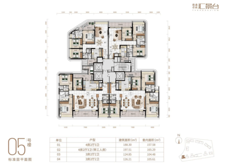 项目由14栋12层小高层组成,产品涵盖123-352㎡三至五房,共8类户型,户型实用率约82-84%。