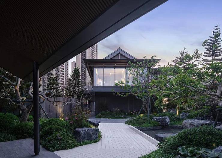 项目以宋代生活为研究模板,结合金地的“科学筑家”理念,通过屋檐、平座、挂落、寻杖等传统中式建筑元素的现代演绎,在功能性与美学感知的平衡上进行精细化的节点设计。“以材为祖”打造全新的现代宋风符号;精工匠造,还原宋代建筑神韵;屋脊设计使用现代材料呈现纤细感、水平感;寻杖在转角望柱搭交而伸出,打造定制化极简的双层绞角造;整体色彩借鉴了宋画里茶白、鹤灰、玄天、缃黄,雅致又有层次感。