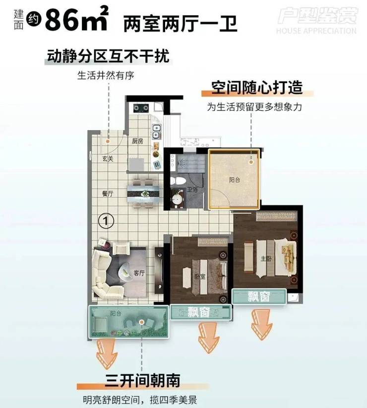 85-86㎡两房是主力户型,南向设计能保证充足采光,部分房源可瞰社区园林;