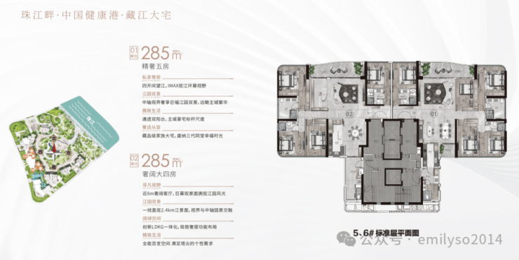 户型:建面约233-285㎡四至五房,东向/东南向一线望江,极致3.4-3.6m层高