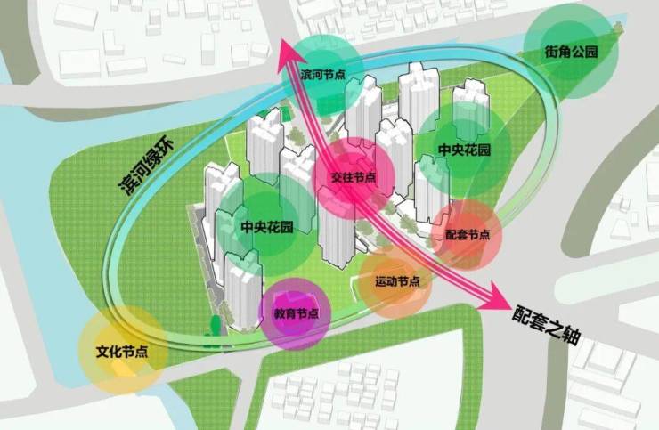 该项目打造一环一轴的规划结构:一环为滨河绿环——营造荔湾休闲都市的温情生活底色;一轴为配套之轴——打造友爱型的邻里社区标杆。