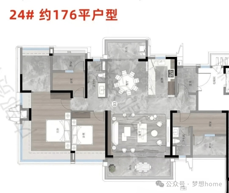 还沿用了多套房化打造思路,最多可形成3个有效的套房空间,不管是多代同堂还是多孩家庭居住都非常合适。