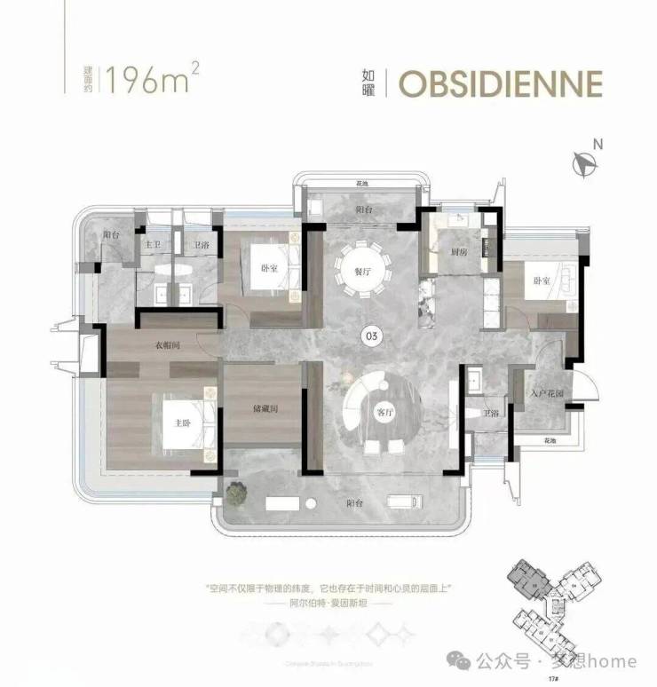 230平户型拥有私家电梯厅、双主套、独立佣人房、南北对流、LDKB大方厅、主卧L型270°飘窗等,大大提升了整体的空间体验。