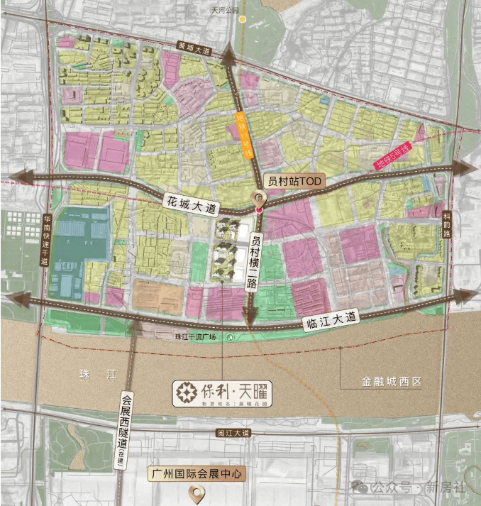 地块位于规划花城大道南侧,紧邻华南快速干线、黄埔大道中、临江大道及科韵路等主要交通干道,这也是天河比较难得的靠近地铁站的盘,地块东北侧距离地铁5号线与11号线交汇的员村站仅150m,5号线+11号线可以连通广州最核心的几个商务圈---珠城、琶洲、天河北、白鹅潭等等,通达性很强。