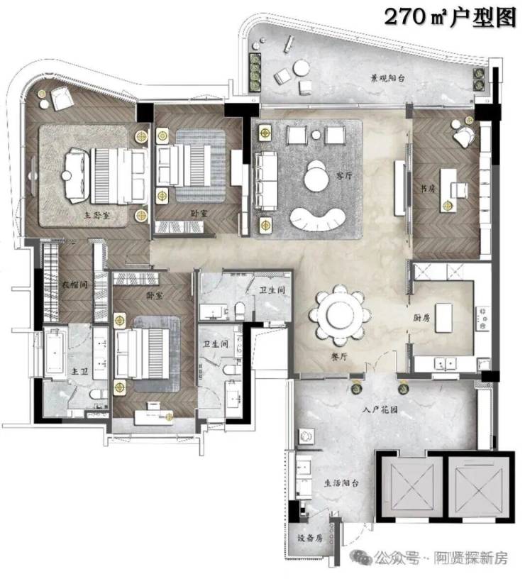 ⑤星级主卧套房,配备衣帽间及四分离卫生间;多套房设计,灵动多功能空间,满足三代同堂居住需求