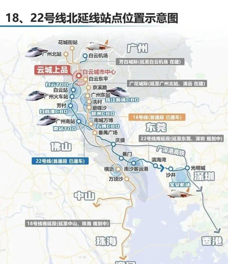 广州地铁22号线,广州唯一串联海陆空的高速地铁线,串联白云机场、广州南站、南沙客运港等海陆空枢纽,打通城市脉络节点,直达大湾区六大核心枢纽