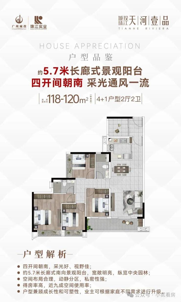 建面120平4+1房,入户处多了一个灵动空间,可改成5房,四开间朝南,全屋大飘窗设计,5.7米观景大阳台