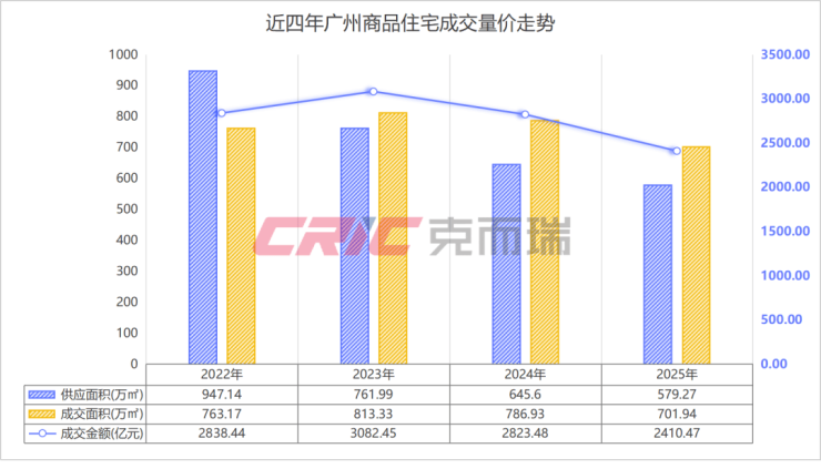 广州方面,克而瑞数据监测显示,2025年广州商品住宅供应面积579.27万㎡,同比减少10%,成交面积701.94万㎡,同比减少11%,成交金额2410.47亿元,同比减少15%。