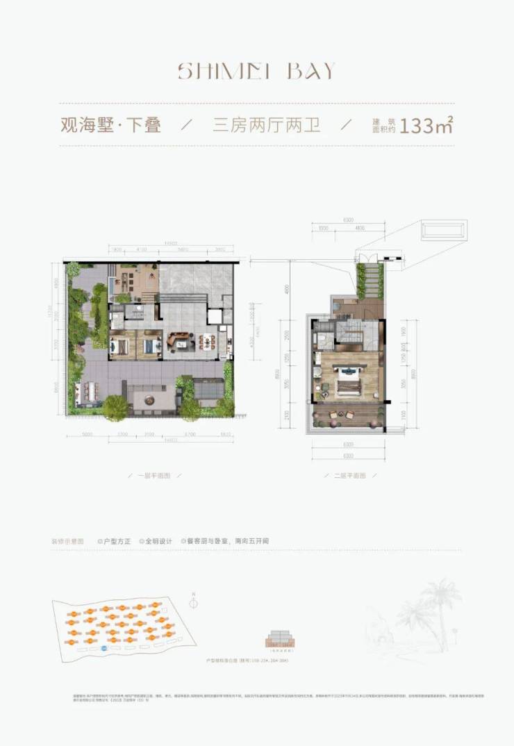 |建筑面积约133㎡○户型方正,全明采光,让海风阳光自在穿行○约8.5m阔景横厅,度假姿态尽显○LDKB专享度假感格局,清晰分区○主卧套房,连接约6m度假阳台,舒阔有度○南向四开间,阳光在家里尽情撒欢○朗阔花园,独立入户,住进自然里