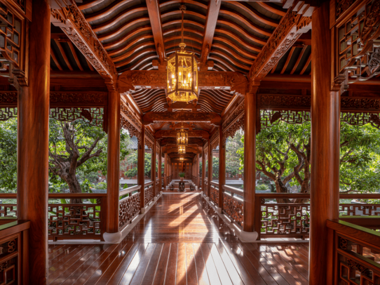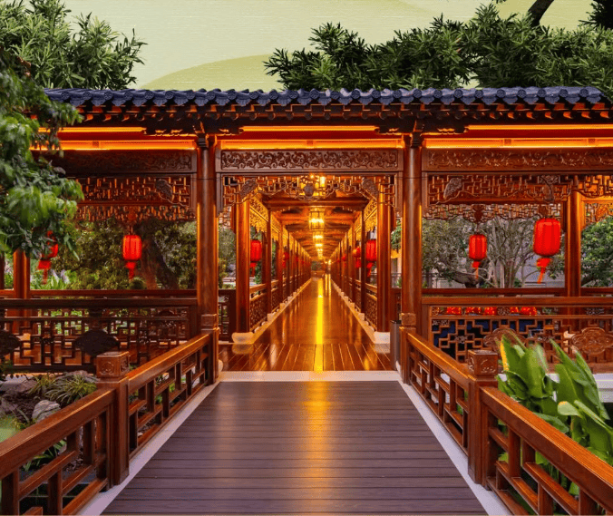 融合晋派大气与徽派精巧,千米风雨连廊串联 21 座亭台廊轩,600 余棵百年名树全冠移植,96 块匾额楹联取材唐诗宋词。