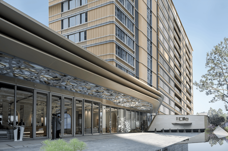 公建化立面,包括全景式系统玻璃门窗、铝板、陶板幕墙系统还有圆角造型。