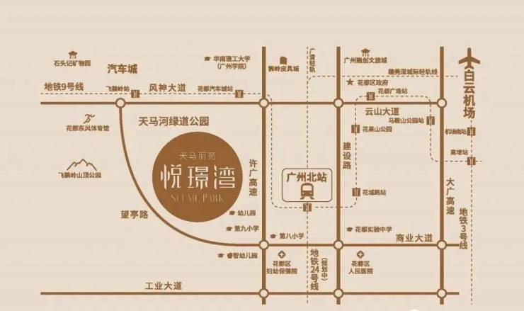 🚗交通配套:天马丽苑·悦璟湾距离广州北站仅有10分钟车程、30分钟车程即可到达广州白云国际机场。道路:望亭路是北站新城重要的道路,直通风神大道、农新路,10分钟即可到达广州北站。通过云山大桥只需要10分钟即可到达花都区府商圈,并接驳迎宾大道,30分钟即可到达广州白云国际机场;双地铁:地铁9号线(已开通)花都汽车城站约800米,地铁24号线(规划中,从白云湖至广州北站)