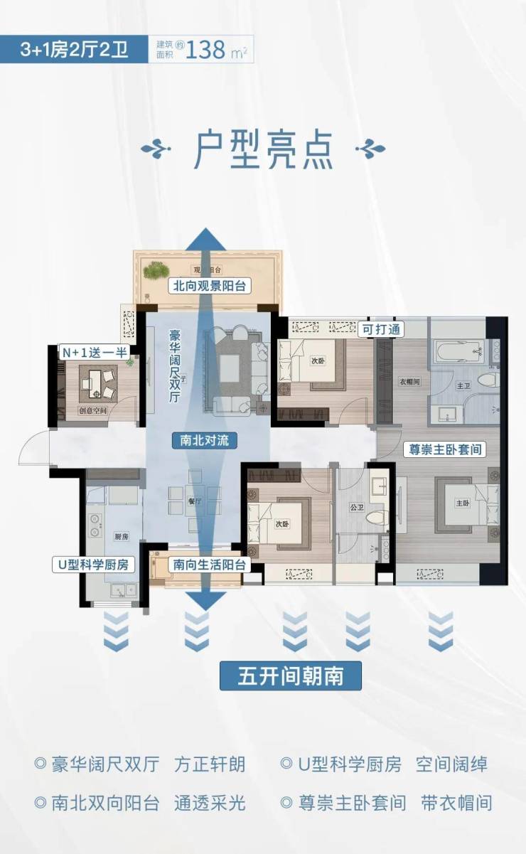 建面约138㎡四房两卫,南北双阳台,5开间朝南 ,高赠送 , 超大主套,百变空间 ,大厨房。