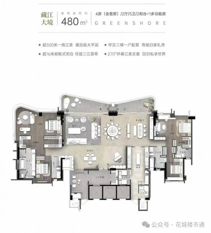• 天启组团(高层):主力户型为140-480平方米四至五房,专梯入户,层高3.3米,一线江景户型配备270°环幕阳台,部分户型赠送空中花园;