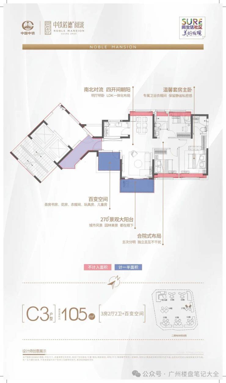 约80-105㎡精装三四房 央企准现房2梯4户、百米楼距、楼王C位、俯瞰6万平园林户户朝南、南北通透、全飘窗赠送方正实用大客厅/大房间/大阳台/大飘窗