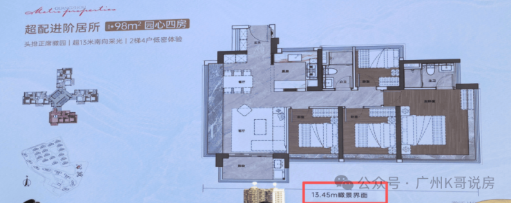 其中,98平做到了四开间朝南,南侧面宽有13.45米,只比118平的面宽少了10公分,尺度感非常不错。