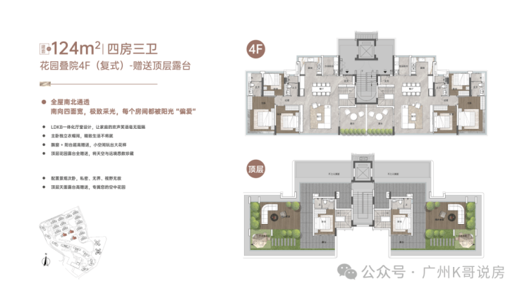 这是最接近墅级形态的户型,下层做了侧花园设计,顶层的天面露台全赠送,实现了约242%的使用率。