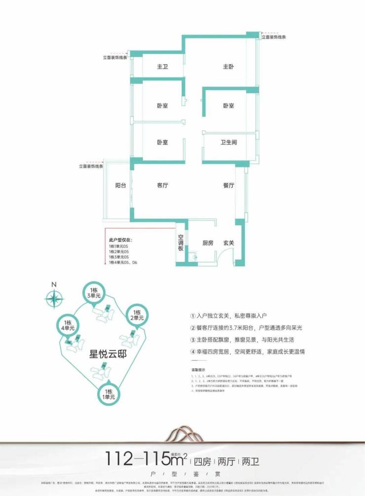 112㎡的4房2厅2卫,设计的竖厅通透格局,客厅3.7米开间,进门独立入户玄关,全屋飘窗设计,得房率:78.16%(不含赠送),阳台主朝西北或东北向。