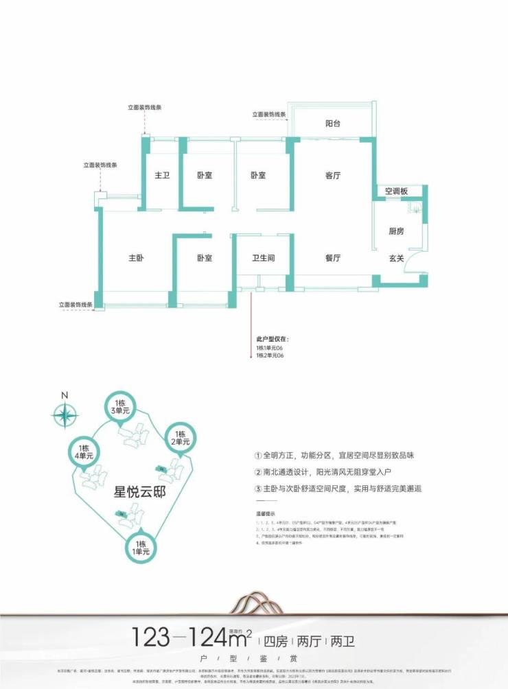 123㎡的4房2厅2卫,设计的竖厅南北通透格局,进门独立入户玄关,全屋飘窗设计,U型厨房,得房率:78.15%(不含赠送),阳台主朝东北向。