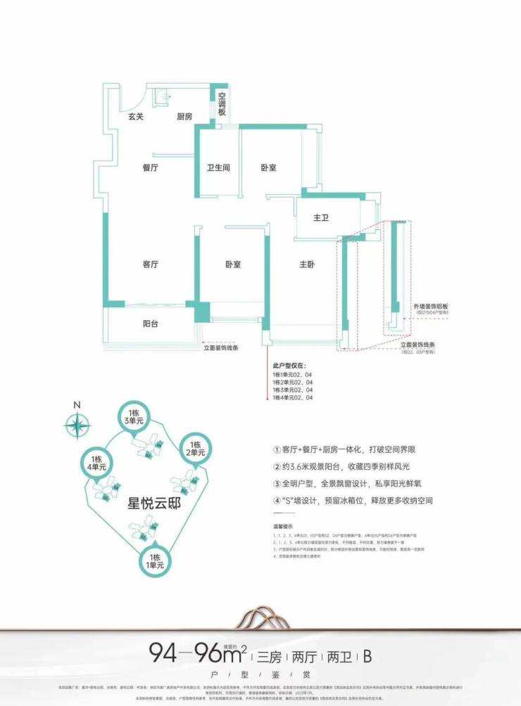 94㎡的3房2厅2卫,设计的经典竖厅格局,客厅3.6米开间,客餐厨一体化,S墙设计预留冰箱位,三开间朝南,U型厨房,得房率:78.15%(不含赠送),有西南及东南朝向。