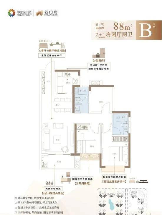 B户型:建面约90㎡ 2+1房两厅两卫