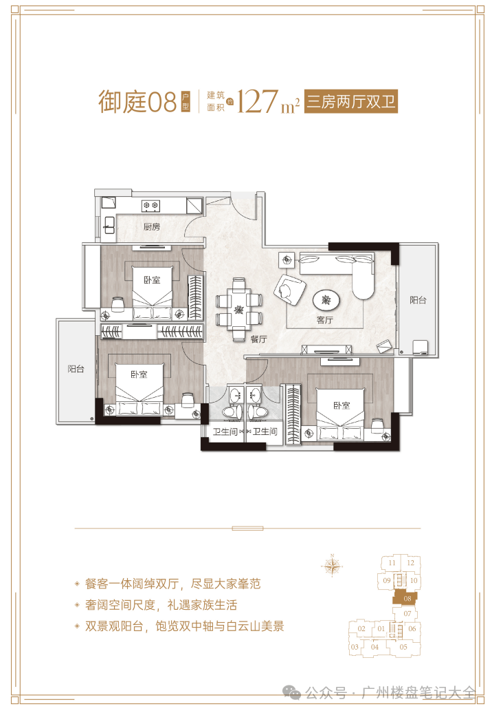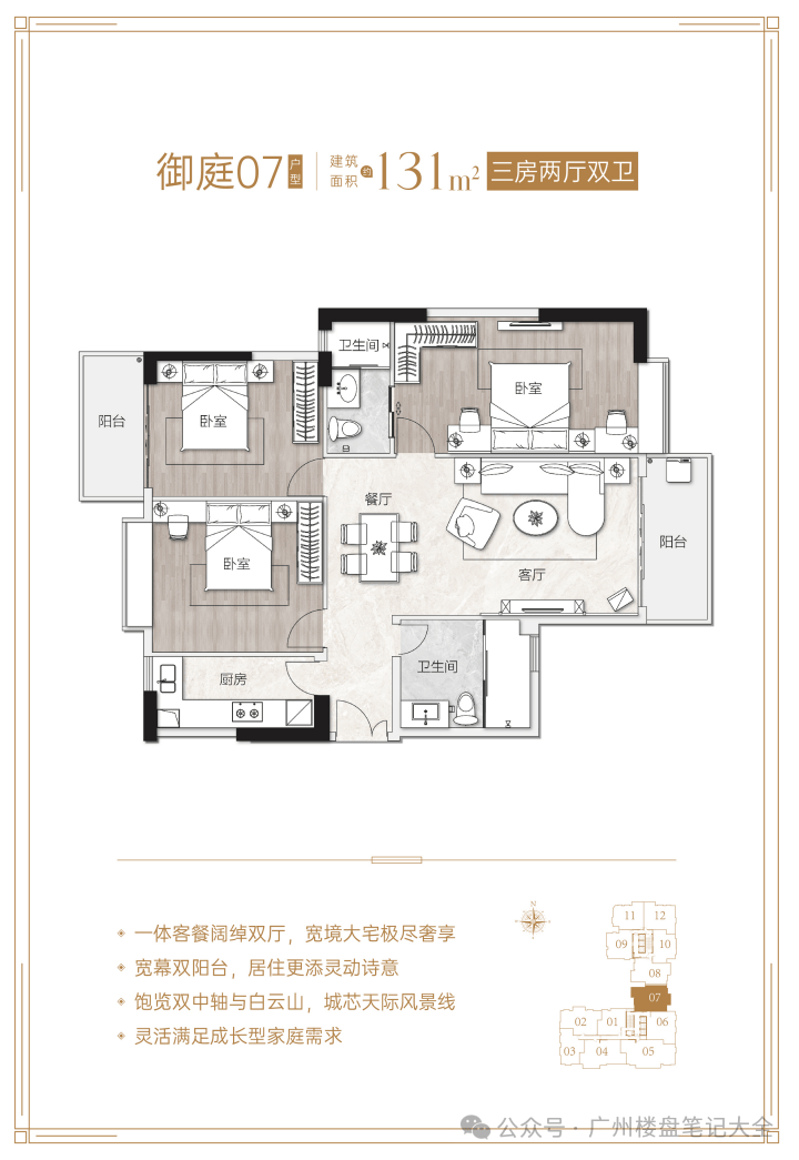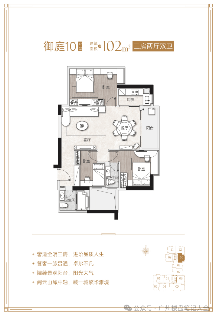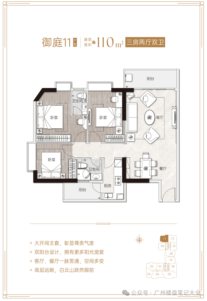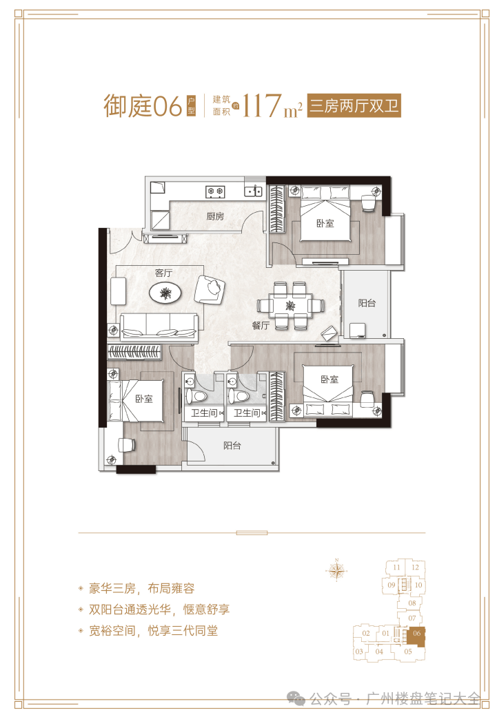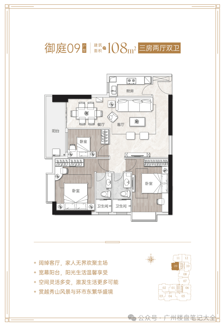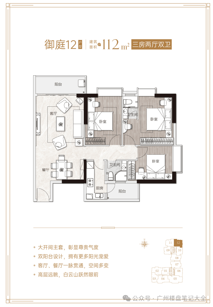 核心优势:项目距地铁5号线淘金站约600米,步行8分钟可达,5站直达珠江新城;对口广州市华侨外国语学校(公办九年一贯制外语特色学校),小升初比例高达56%,中考成绩连续14年居越秀区公办学校之首;周边有丽柏广场、友谊商店、中环广场等高端商业配套,步行可达;紧邻麓湖公园、越秀公园、黄花岗公园等生态资源;配备超4100㎡四季常绿园林、六大主题社区泛会所等高端配套。