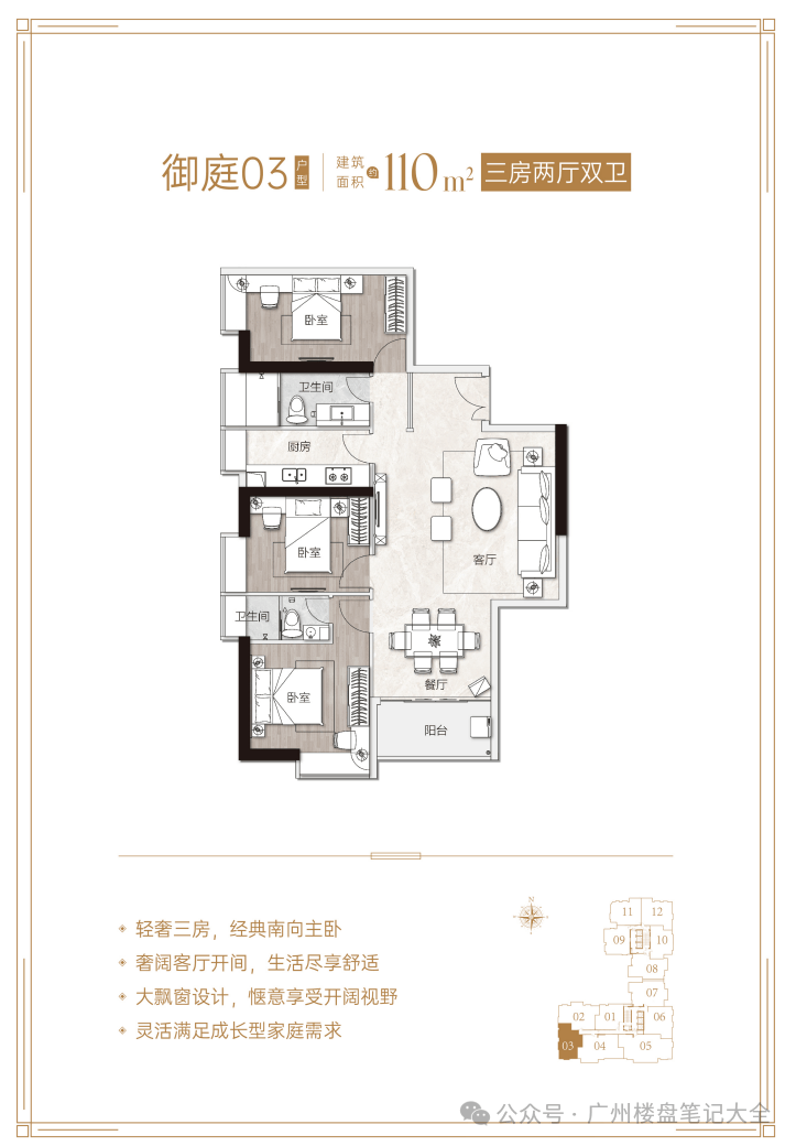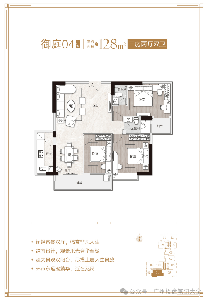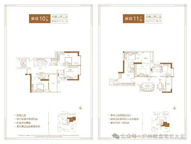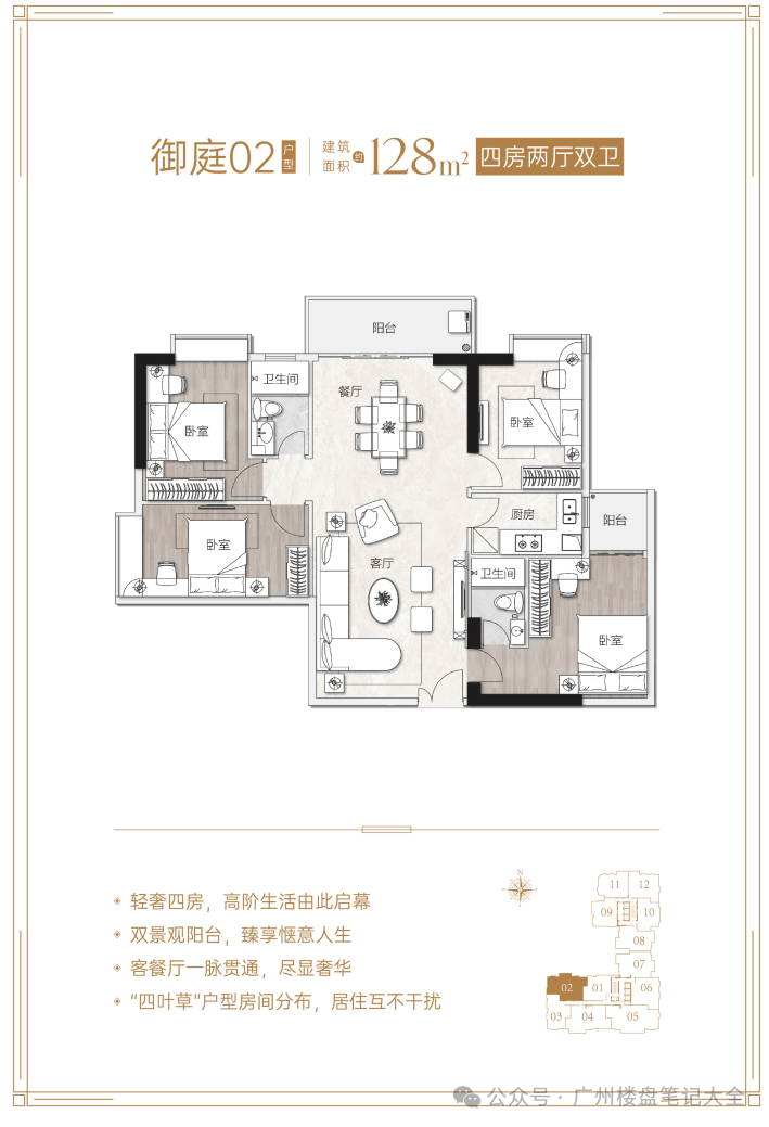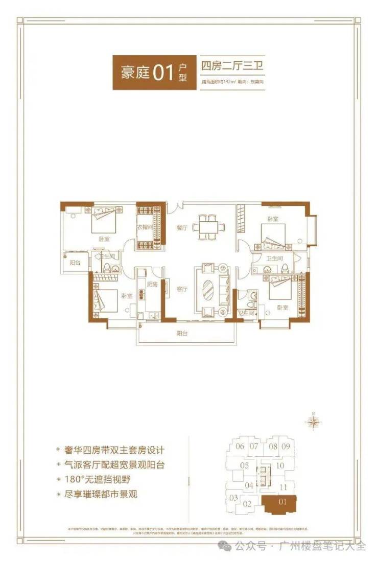 产品信息:项目主推建面约84-191㎡二至四房,备案均价约7.18-11万/㎡,折后总价430-2100万/套。其中84㎡两房两卫折后总价430-480万,102㎡三房两卫718万起,128㎡四房两卫900万起,191㎡四房三卫2100万起。户型采用4梯11户设计,得房率约81-82%,配备LDKB一体化布局、270°转角飘窗、U型厨房等配置,部分户型南北通透、四开间朝南。