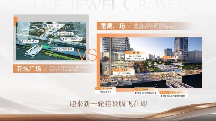 番禺未来新中心:番禺广场板块被定位为番禺区公共服务中心和轨道交通枢纽,打造为以交通枢纽、行政办公、文化休闲、商业商务等功能为主导的番禺未来新中心。番禺广场地下规划5层约18万㎡空间,对标花城广场打造“地下商业+地上公园”发展模式,未来承载千万级客流。