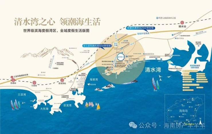 项目地处北纬18°以南,距三亚市区直线距离约45公里,尊踞大三亚醇熟生活圈;位于清水湾度假区中央核心,坐拥清水湾万亩文旅醇熟配套,紧邻陵水黎安国际教育创新试验区,致力于打造清水湾片区产品标杆。