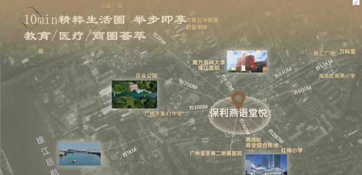 4大商圈:紧邻约3.4万方商业综合体,5公里内畅联江南西、中大、江燕、乐峰广场(1.5公里)四大商圈环绕,万科里(1公里)、富力海珠城2公里。