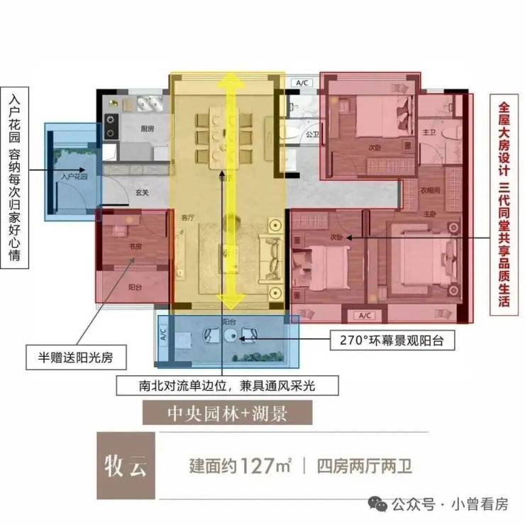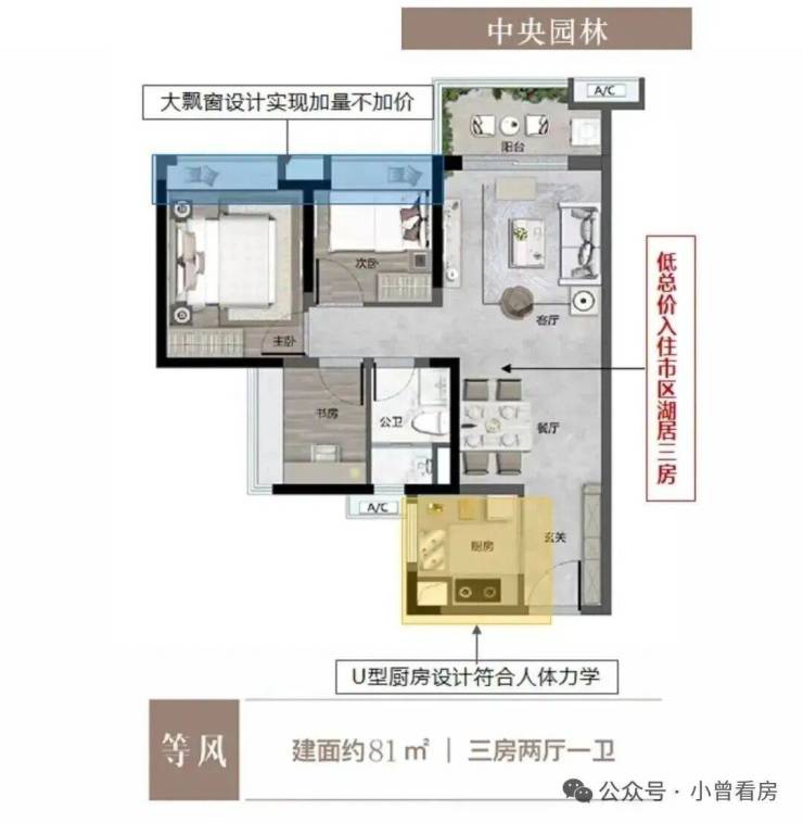 特点:三进式设计提高全屋实用率,270°环幕景观阳台,单边位南北对流采光通风。