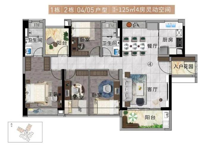 建面约125㎡四室两厅: