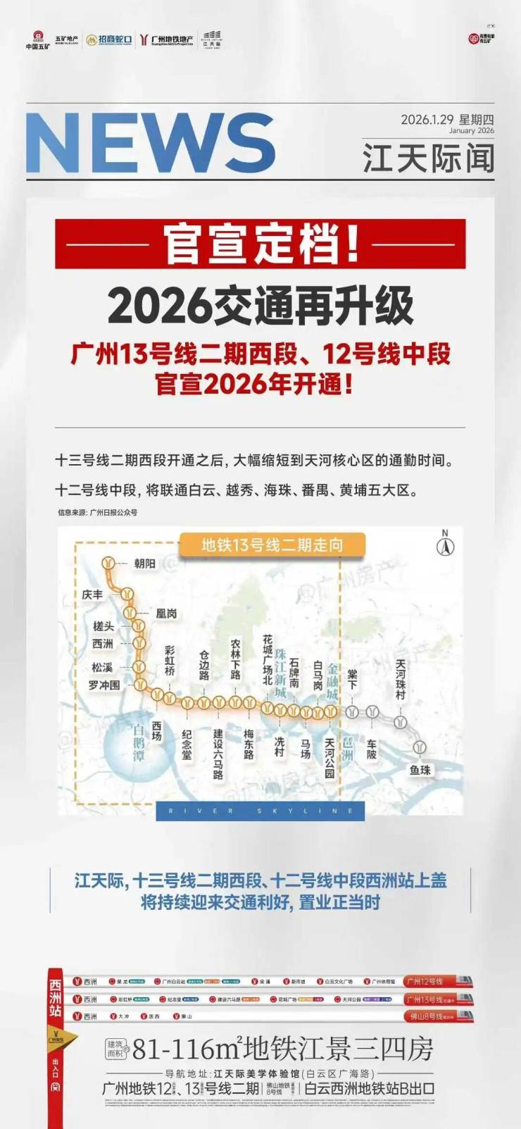 广州12号线、13号线、佛山8号线交汇,贯穿广州东西人文经济大动脉,广州五大区域核心版块无缝直达。