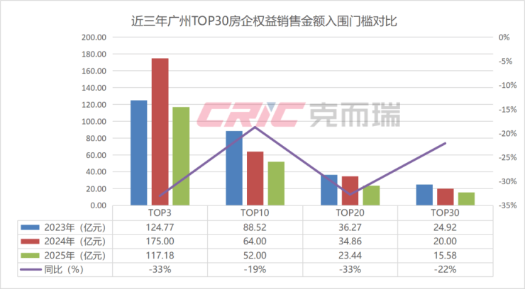 在入围门槛上,克而瑞数据监测显示,2025年广州权益金额TOP3梯队房企入围门槛117.18亿元,同比减少33%,TOP10梯队房企入围门槛52亿元,同比减少19%,TOP20梯队房企入围门槛23.44亿元,同比减少33%,TOP30梯队房企入围门槛15.58亿元,同比减少22%。