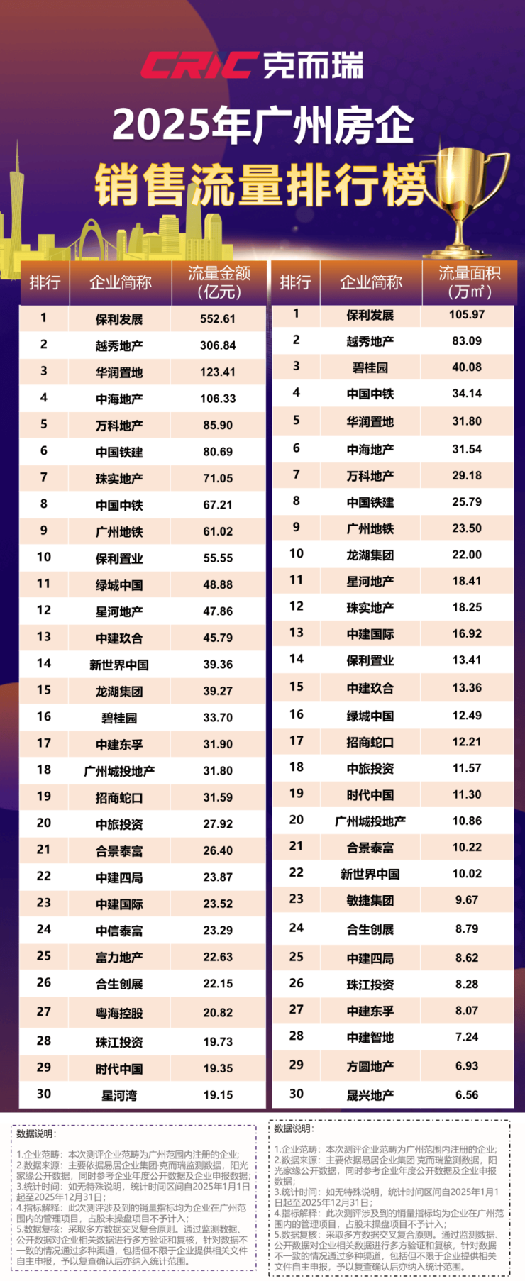越秀地产以229.17亿元权益金额,308.22亿元全口径金额,306.84亿元流量金额,83.09万㎡流量面积包揽四榜排行亚军;2025年越秀地产持续深耕广州市场,旗下项目越秀观樾、越秀天河和樾府、越秀·桂悦东晓等项目在中心四区取得了优异的销售表现。