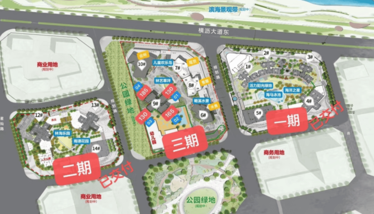 项目分为三期开发,现在的一期的1-4栋,二期的12/13栋基本已经售罄,目前在售是三期7/8栋,后期还有6/9栋未售,在售的户型116-235m²,其中一期1#、2#楼于2024年7月13日已经交房,下方是楼盘实体图片